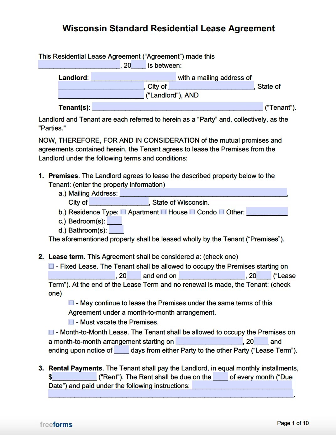 Our sample forms are blank, fillable and printable as pdf or word documents. A wisconsin residential lease agreement is for tenants and landlords seeking a fixed agreement for the use of property in exchange for rent. Before authorizing an agreement, the landlord will usually want to check the tenant's credit and income.